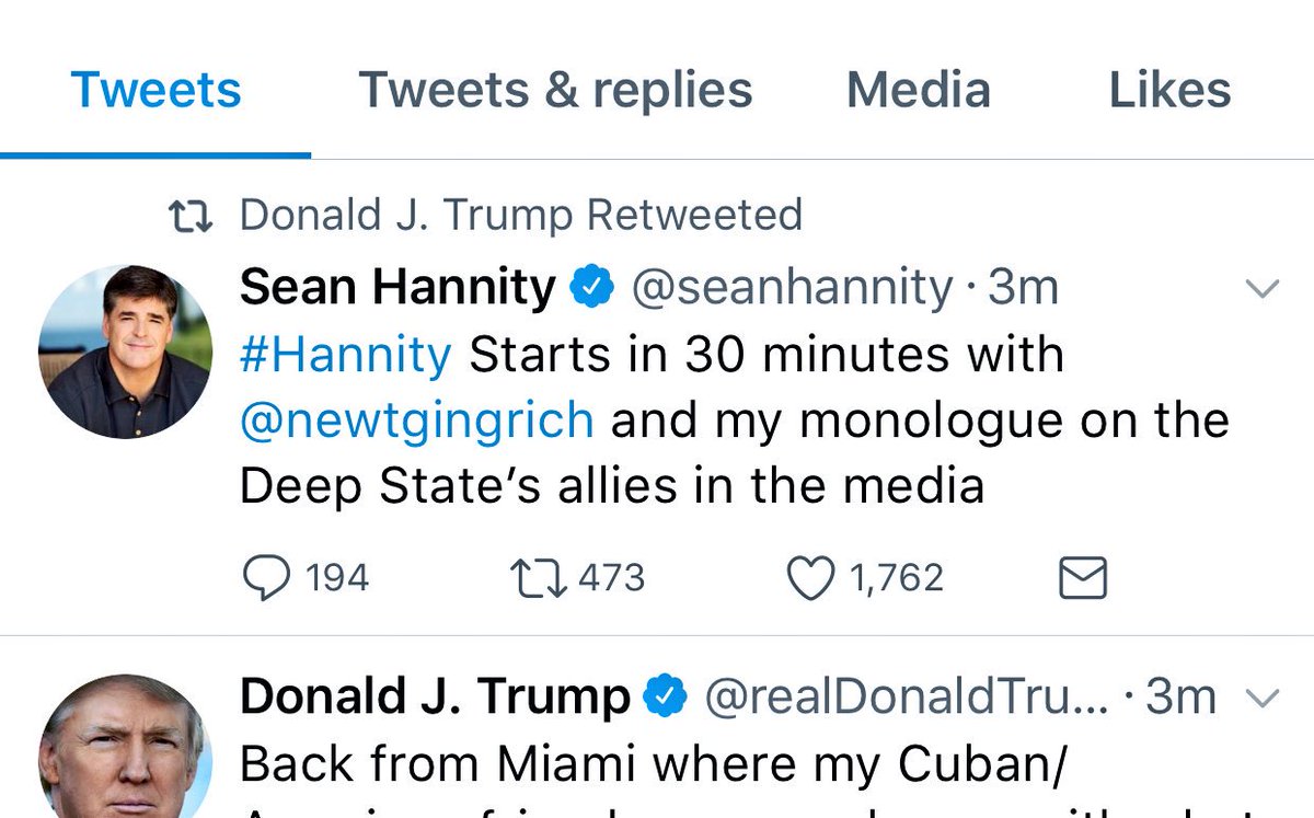 Is the president watching? Hannity says "deep state" leakers are now a "clear and present danger to this country, and to you"pic.twitter.com/wTaSZHhAwv