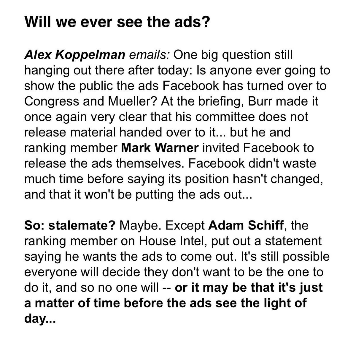 Give the ads to Comey He has an Ivy League professor whose creepy enough to leak any FBI secrets Mueller approved act