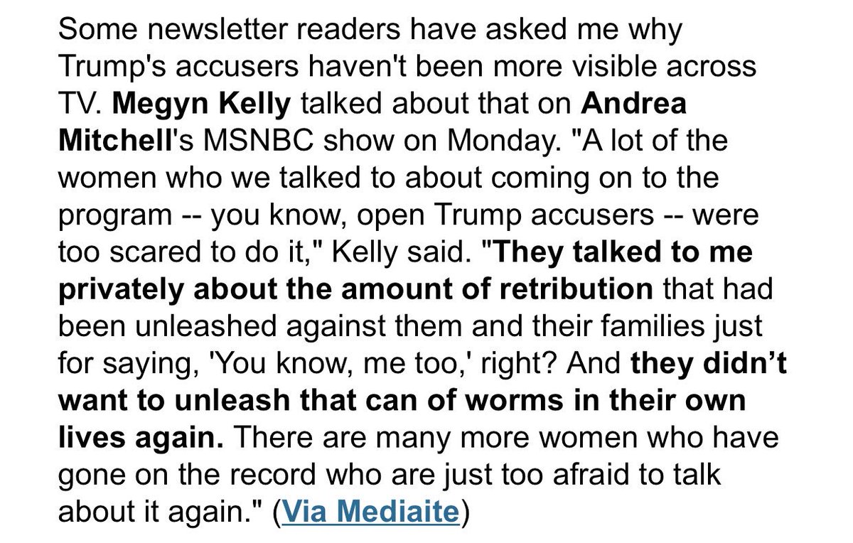Despite their alleged fears, they agreed to appear on national TV with Megyn Kelly, a woman who last year said she had made peace with Trump. Evidently the women aren't as fearful as you purport they are & Megyn lied.