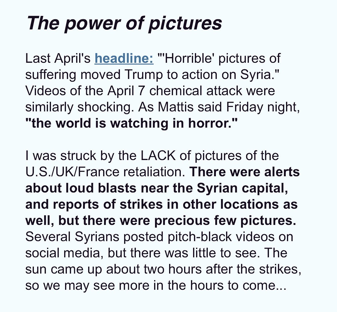 Dumb comments. These attacks by design are executed in the dead of night. We will never see pictures of these sites that tell much of a story. These sites are controlled by the Assad regime and images will be used for propaganda purposes only.