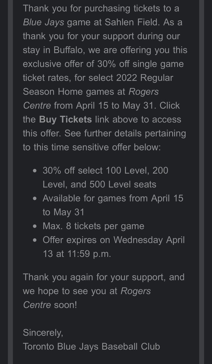 This is pretty cool, the Toronto Blue Jays are offering 30 percent off single game tickets for one game from April 15 to May 31 to anyone who purchased tickets to a home game for when the Blue Jays played games at Sahlen Field in Buffalo.