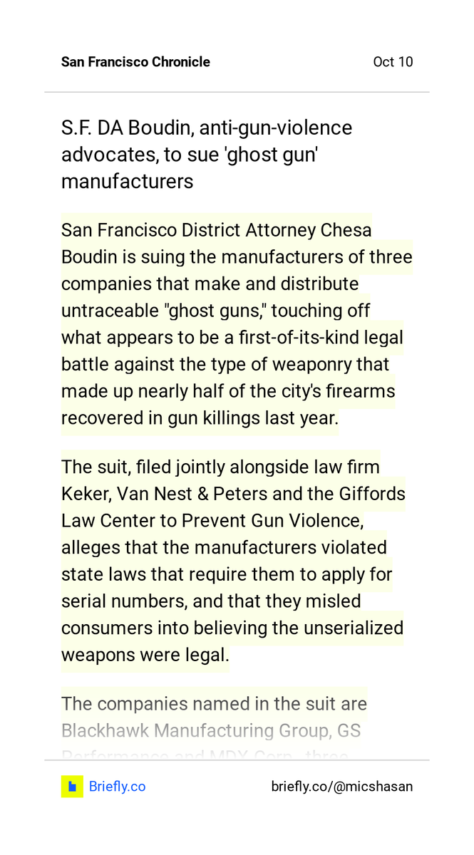 https://briefly.co/anchor/San_Francisco/story/sf-da-boudin-anti-gun-violence-advocates-to-sue-ghost-gun-manufacturers?f=caerphilly&utm_source=Twitter&utm_medium=autotweet&utm_content=highlighted&utm_campaign=San_Francisco …
