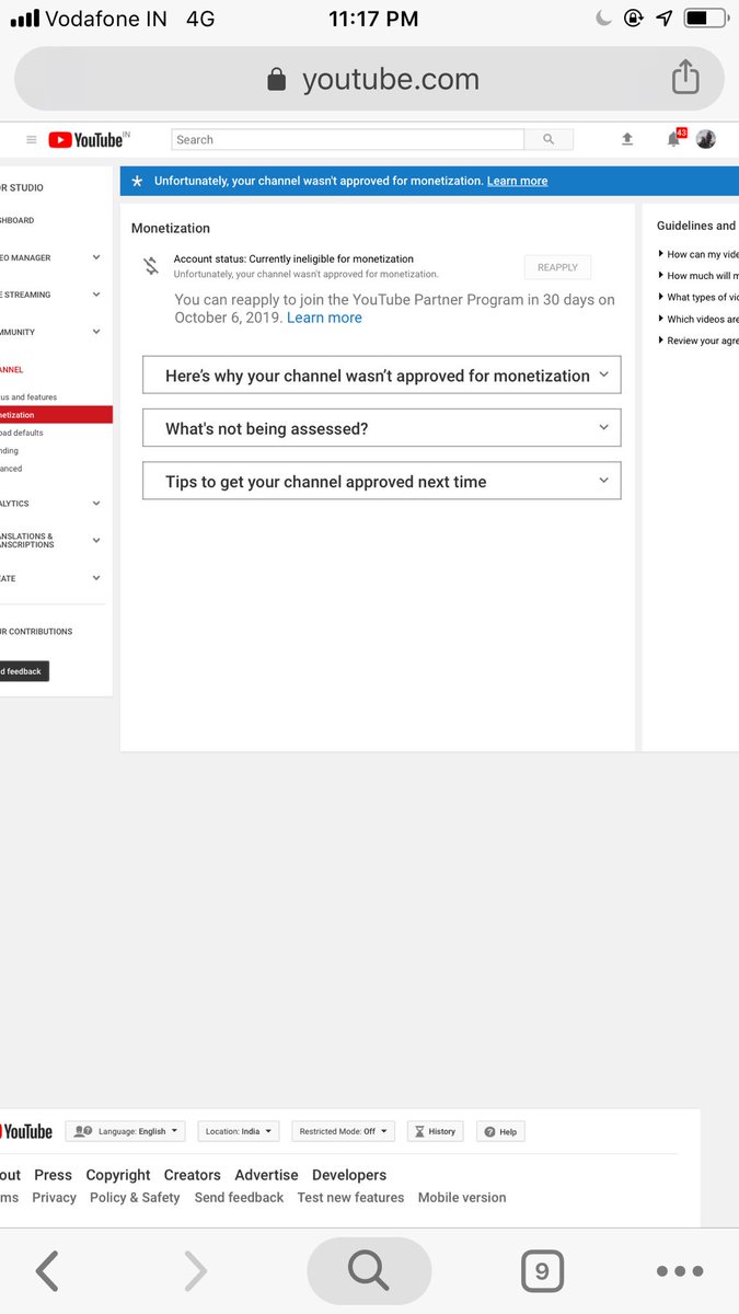 Hello Team YouTube My monetization is not on, what is this my channel problem my channel wasn’t approved for monetization #TeamYoutube #YTCreatorspic.twitter.com/I74d9x2PZu