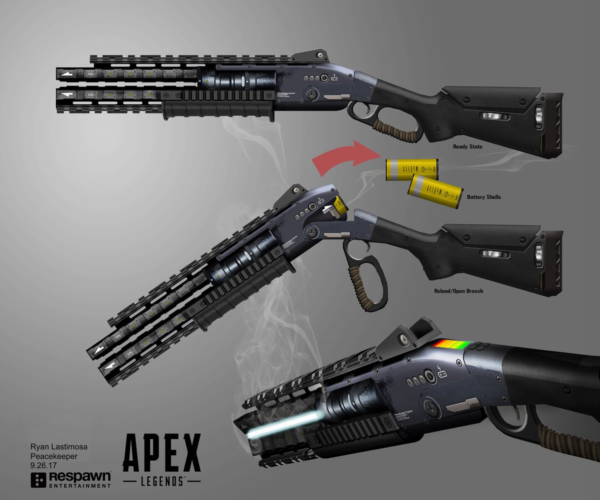 Concept art for the Peacekeeper, a lever action, energy actuated shotgun in Apex Legends. New weapons start with silhouettes to define the shape and working parts to indicate a weapon's "snap read". Players can adjust their strategy once a visual indication is made at distance.pic.twitter.com/8LMt8nzjvP