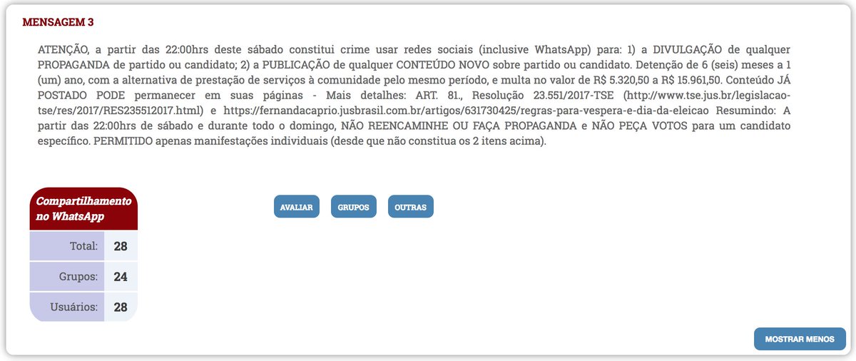 According to a WhatsApp monitor built by fact-checking group Eleições Sem Fake, the top four most-shared public WhatsApp posts in Brazil yesterday were rumors that Brazil's election commission was going to stop Bolsonaro supporters from voting. #Eleições2018pic.twitter.com/B1xsS5dLsl