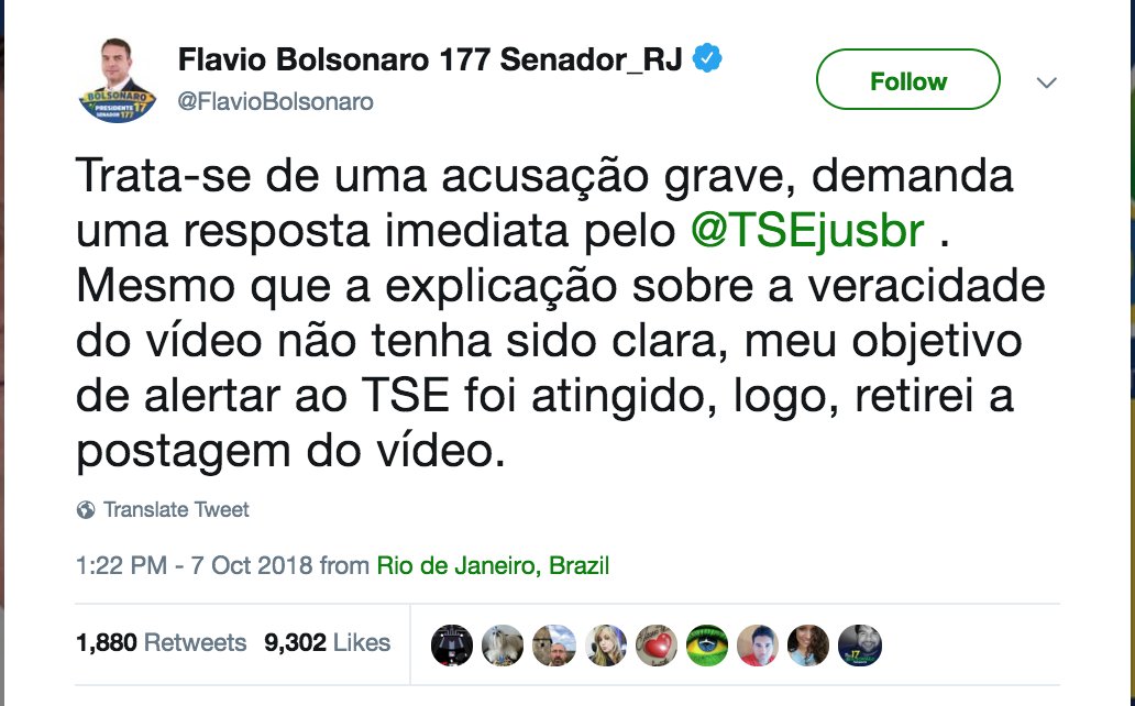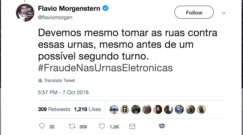 Infowars' Paul Joseph Watson shared an edited video of a Brazilian voting machine automatically voting for leftist candidate Haddad and it currently has over 3,000 retweets. Globo has a breakdown of how the video was faked here: https://extra.globo.com/fato-ou-fake/e-fake-video-em-que-eleitor-seleciona-tecla-1-aparece-automaticamente-candidato-fernando-haddad-na-urna-23136596.html?utm_source=Facebook&utm_medium=Social&utm_campaign=Extra … #Eleições2018pic.twitter.com/azcfSRHcxq