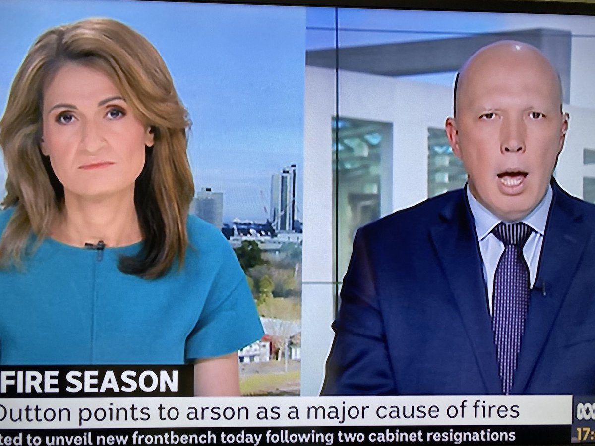 @abcnews this it totally irresponsible to leave this arson lie up on the screen and for the newsreader not to correct it before or afterwards. Kudos to the interviewer @PatsKarvelas who tried to correct Dutton but he just slid on to next lie.#thisIsNotJournalismpic.twitter.com/wBgvlwAguG
