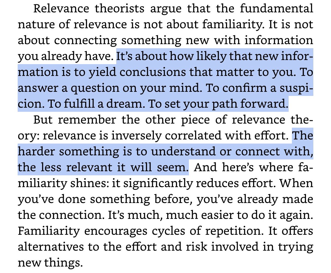 I hadn’t consciously noticed relevance’s relation to the ease of a subject matter — “The harder something is to understand or connect with, the less relevant it will seem.”pic.twitter.com/Bli0PSh3XE
