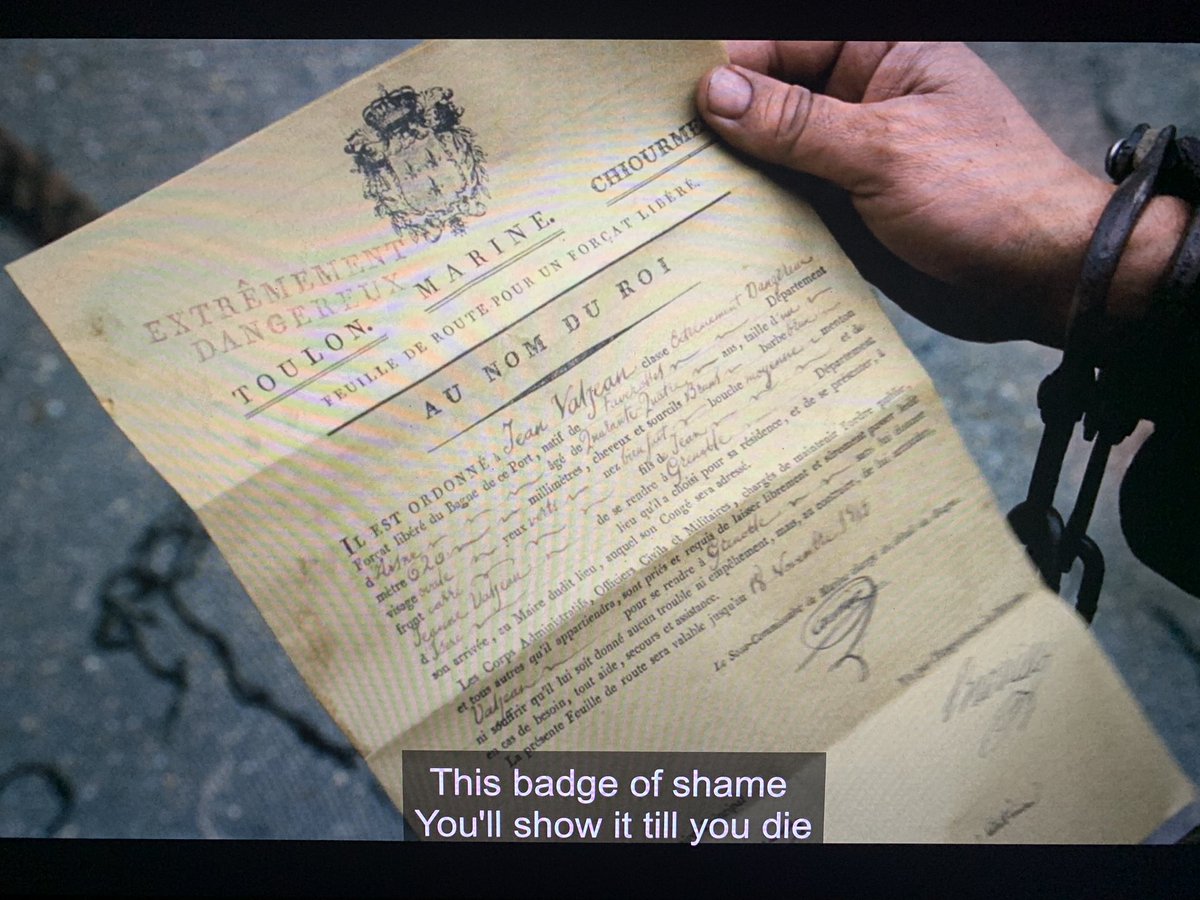Valjean gets his papers—au nom du roi, appropriately—setting off a theme: will people see him or the paper? The next few scenes are filled with people demanding to “see his papers”, rather than simply seeing himpic.twitter.com/7gxIyMmslf