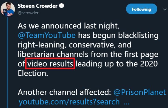 As we announced last night, @TeamYouTube has begun blacklisting right-leaning, conservative, and libertarian channels from the first page of video results leading up to the 2020 Election. Another channel affected: @PrisonPlanet https://www.youtube.com/results?search_query=Paul+Joseph+Watson&sp=EgIQAQ%253D%253D …pic.twitter.com/068LDcyrpT