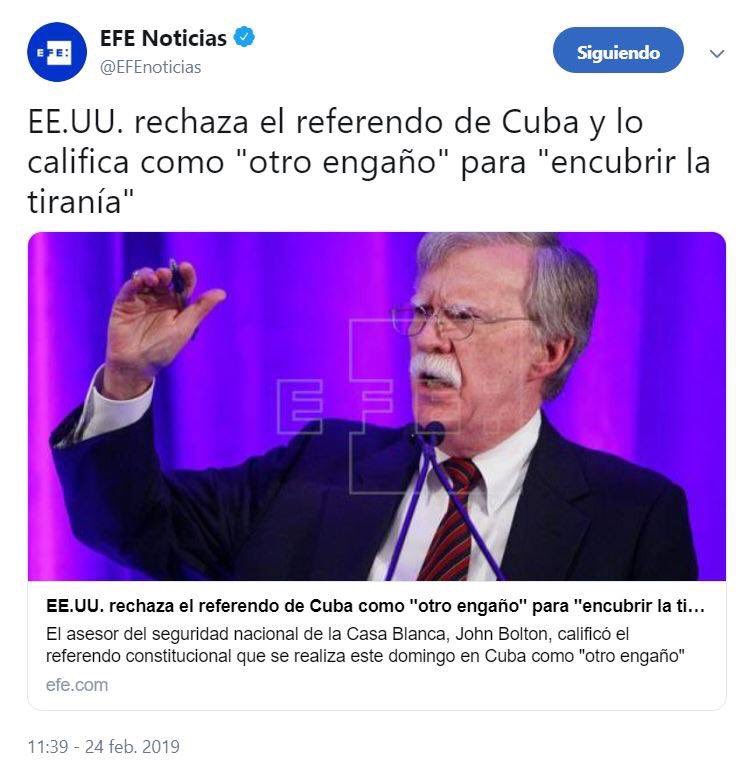 Sec. de Estado #EEUU calumnia a #Cuba para desviar la atención de su fracaso en #Venezuela. El pueblo cubano, libre y soberano, ratificó la Constitución con un 87% de los votos. El Presidente Donald Trump obtuvo el 46% de los votos y 3 millones menos que Hillary Clinton.