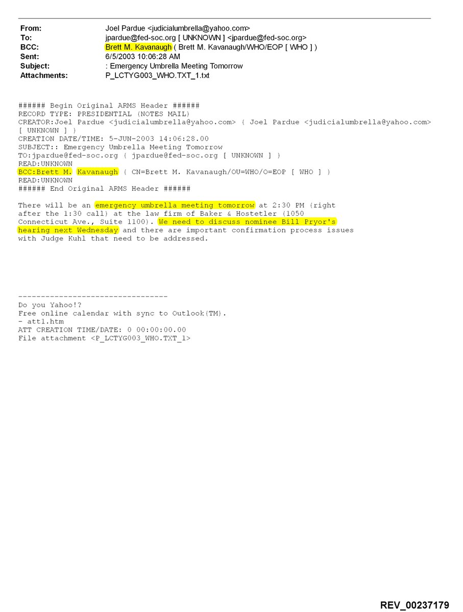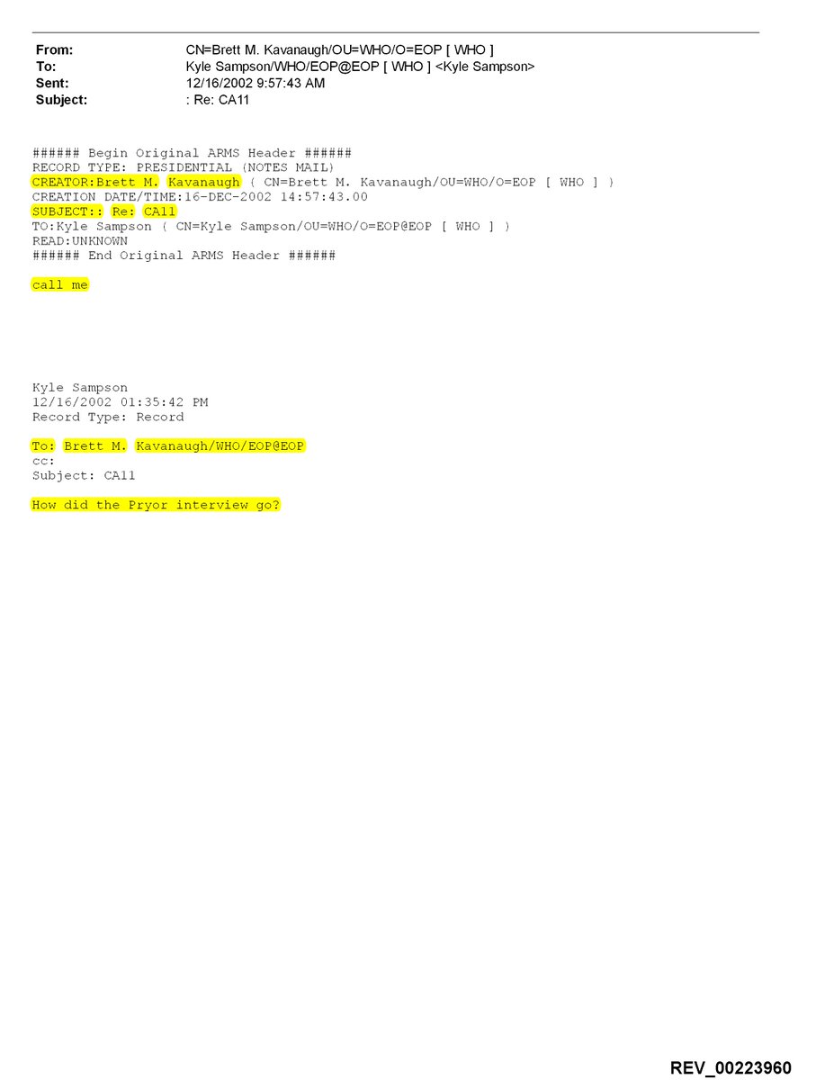 BREAKING: Brett Kavanaugh was asked in 2004 about whether he was involved in the nomination of Bill Pryor. He said “I was not involved in handling his nomination" Newly released emails show that's not true. Asked about how Pryor's interview went, he replied "CALL ME."pic.twitter.com/63Wb5uY95G
