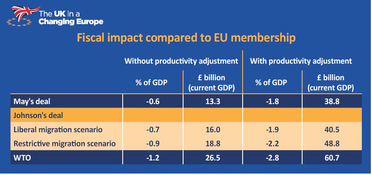 The economic impact of Boris Johnson’s Brexit proposals: UK out of customs union, plus at most a minimal "Canada-minus" FTA, means GDP hit of up to 7%, and fiscal cost of up to £50 billion. Our new report, out now: https://ukandeu.ac.uk/wp-content/uploads/2019/10/The-economic-impact-of-Boris-Johnsons-Brexit-proposals.pdf …pic.twitter.com/Hj8Jz0VqKk