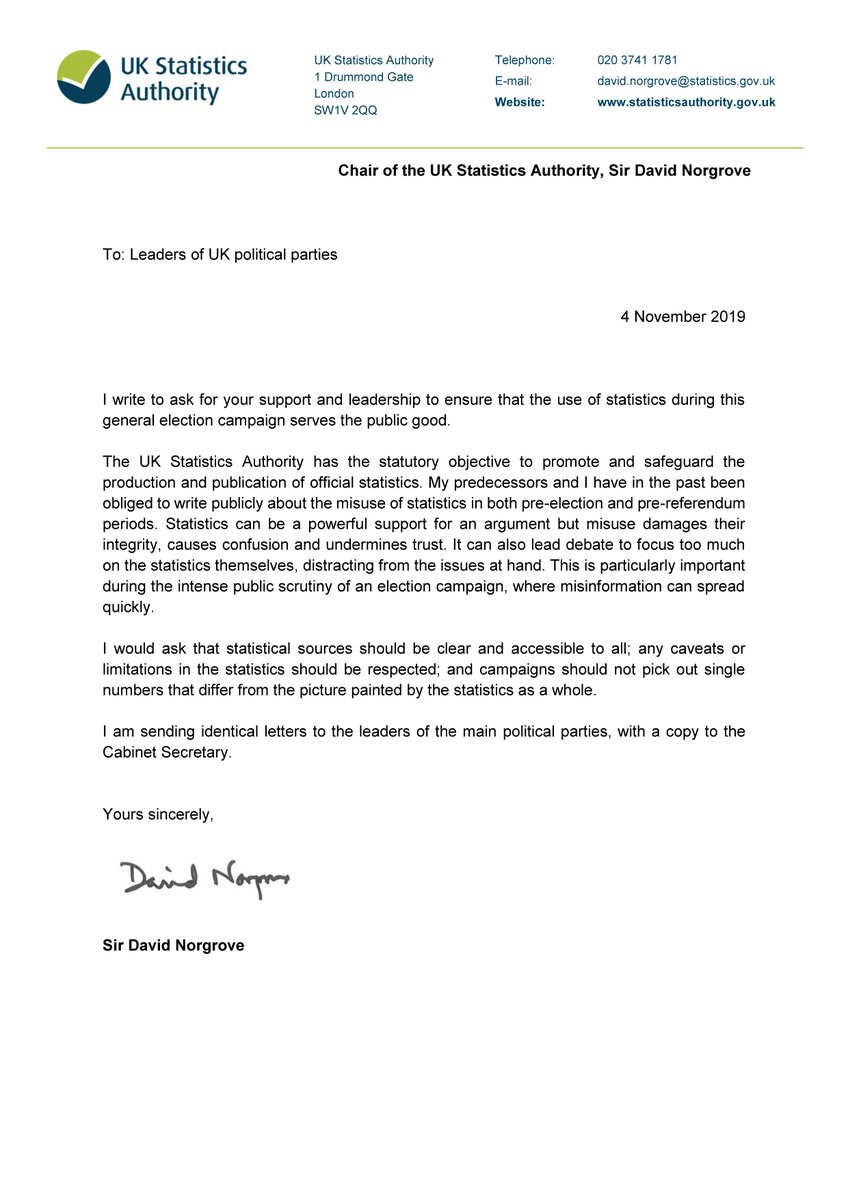 Sir David Norgrove has written to the leaders of the UK's political parties reminding them of their duty to use statistics accurately and fairly in the forthcoming election campaign. http://ow.ly/BzC350x28iQ pic.twitter.com/YrapunnaGh