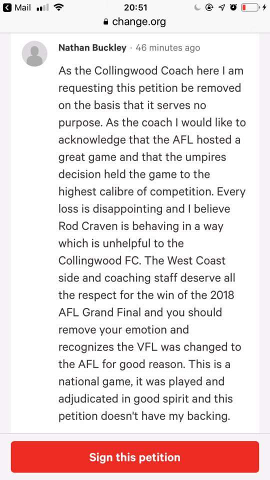 Petition , lmfao but in all fairness it was plain as day as you can see , that collingwood magpies were robbed because of this call , not even sure how they could get it wrong it was that obvious .. clearly obstructed from the contest and then sheed baulks and gets his free shot?
