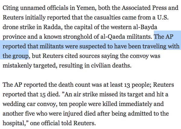 @AP for reporting militants were suspected to be among those headed to the wedding. http://world.time.com/2013/12/12/conflicting-reports-after-drone-strike-hits-wedding-convoy-in-yemen/#ixzz2nIm2YOQh …pic.twitter.com/O8qBnlhwQt