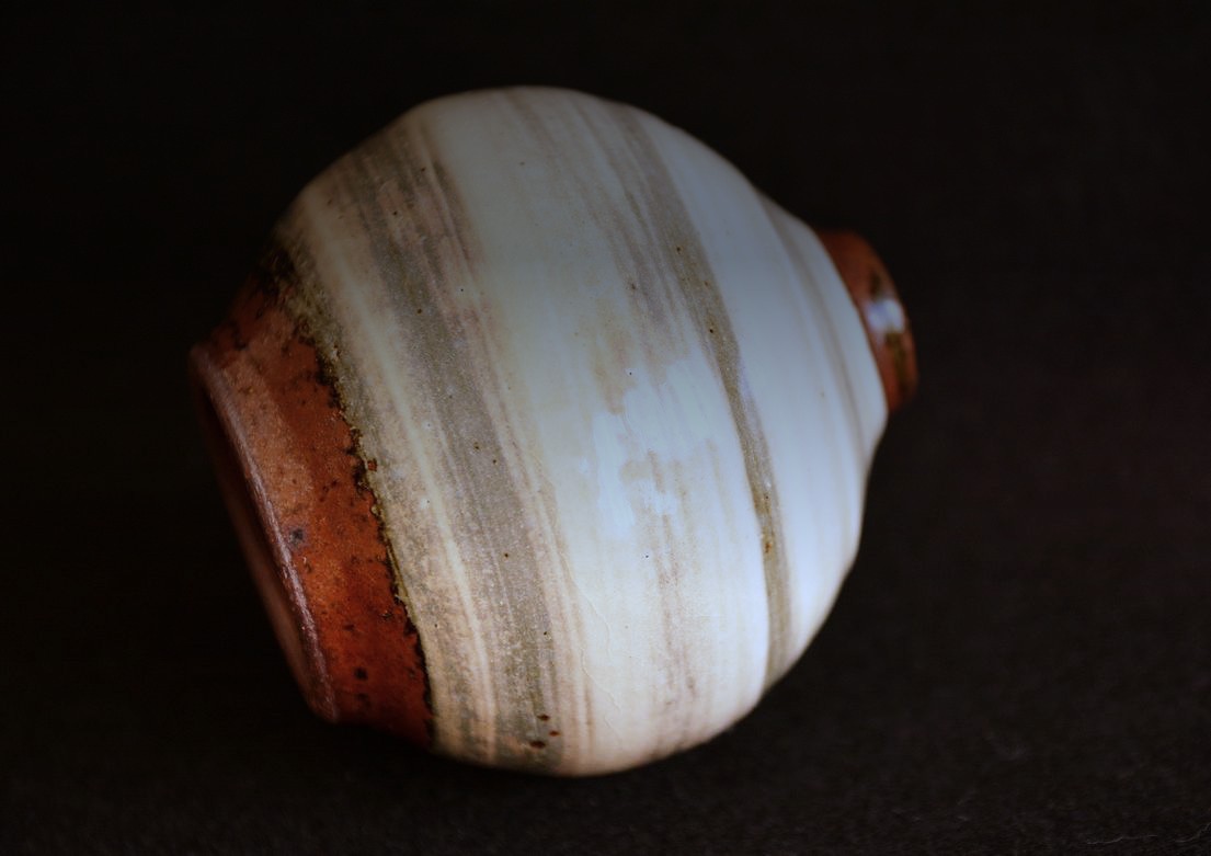お土産に買った刷毛目の一輪挿し 民陶らしくない垢抜けた花瓶だと見えたのですが口縁や高台に見える鉄釉の焼けかたは益子らしく素朴に仕上がっています。pic.twitter.com/nfdGNGYV4i