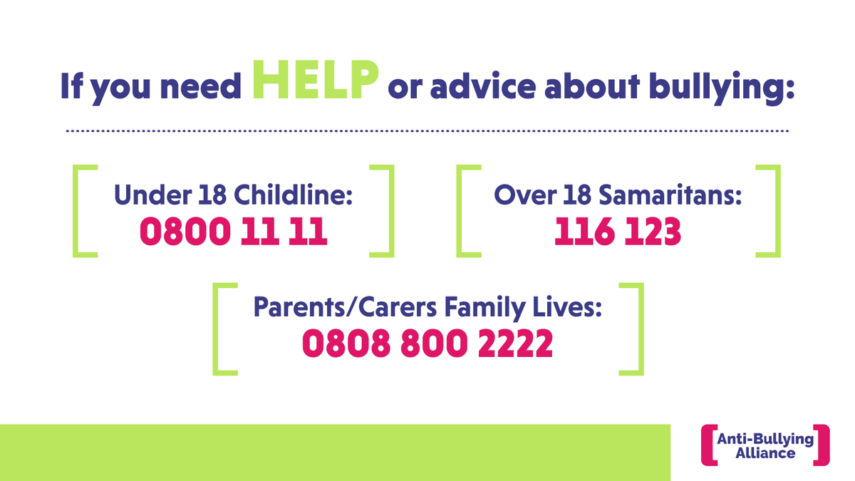 @childline on 0800 11 11 For Over 18s call@samaritans on 116 123 For parents/carers call@FamilyLives on 0808 800 2222 .#talktosomeone#someonetotalkto#notalone#bullyingpic.twitter.com/dyoQq8YHZk
