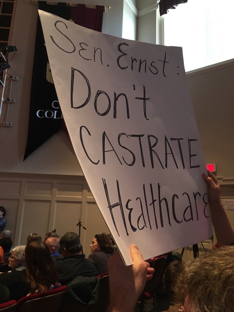 Lady with a sign next to me: "Sen. Ernst, please don't castrate health care"