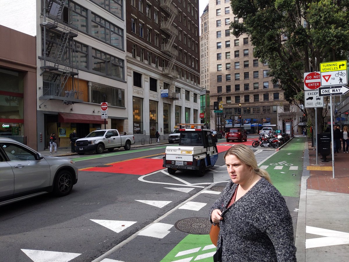 Thing is, though, neither McAllister nor Jones has signage here saying that cars should stay off of Market Street. McAllister does have new signage, but it's TWO BLOCKS AWAY from Market, all the way up at Hyde. So I don't really blame these drivers.pic.twitter.com/G2gZ01Nu4k