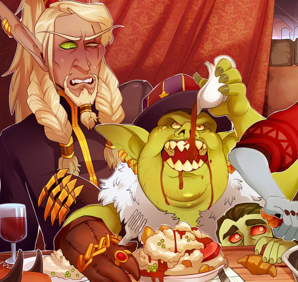 This month's Patreon illustration was for a #Warcraft faction leader dinner! One big (chaotic) Azeroth meal for Thanksgiving / Pilgrim's bounty 🥔🍽️🥧🍽️🦃🍽️🍷🍽️🥐 #worldofwarcraftpic.twitter.com/iECZlvpFwS