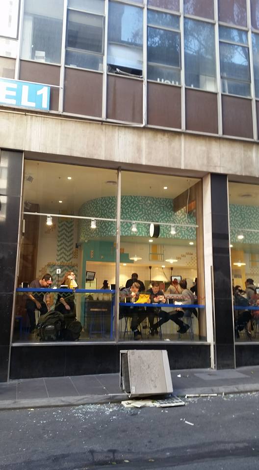 Bad. An air-cond unit has fallen off a building in Lt Bourke Street, onto the footpath. Image: a. pustola