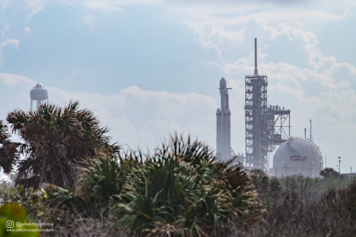 Falcon Heavy went vertical at LC-39A for the first time today! Here’s a few shots (taken through much haze) from Playalinda Beach. pic.twitter.com/gsOL9tAfTN