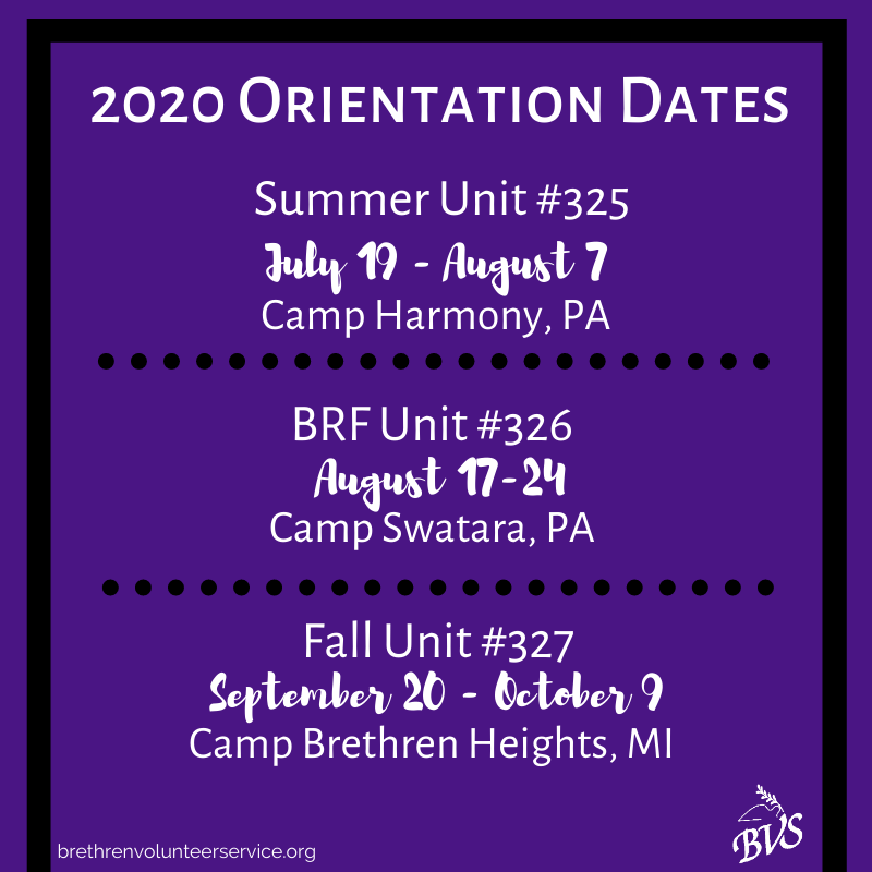 Are you thinking about applying for BVS in 2020? Here are the dates for our orientation units. Check out our website to see what projects you might be interested in: http://www.brethren.org/bvs/ pic.twitter.com/ruwTIf7Ke6