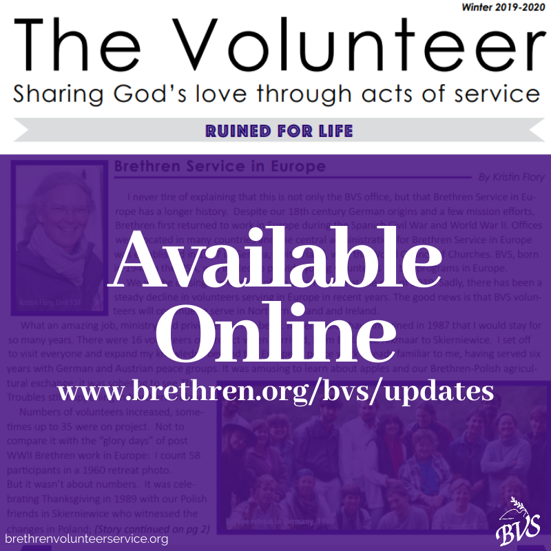 The Winter 2019-2020 Newsletter is now available online! Check it out to learn about updates in BVS Europe and hear stories from volunteers who were "Ruined for Life" after serving in BVS. http://www.brethren.org/bvs/updates