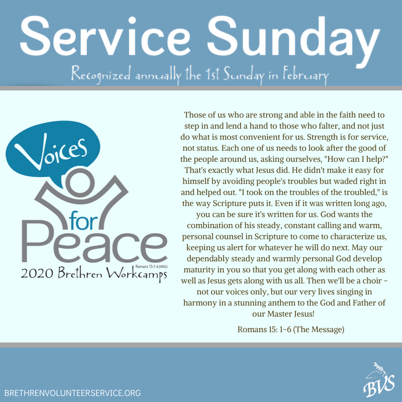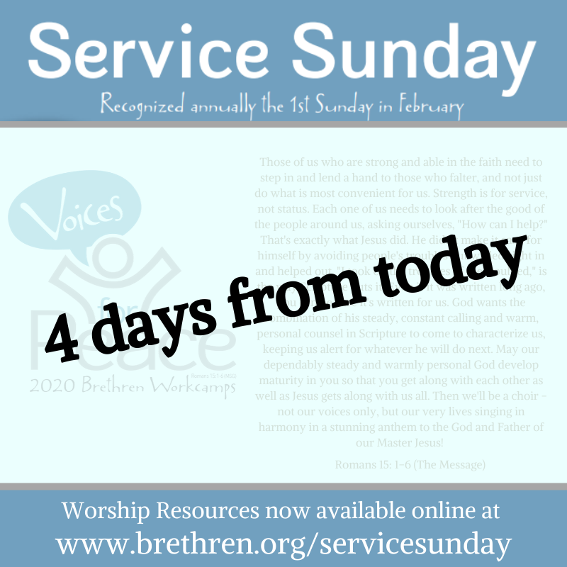 Service Sunday is February 2, 2020! Worship resources are now available at http://www.brethren.org/servicesunday . Visit our website and start planning!