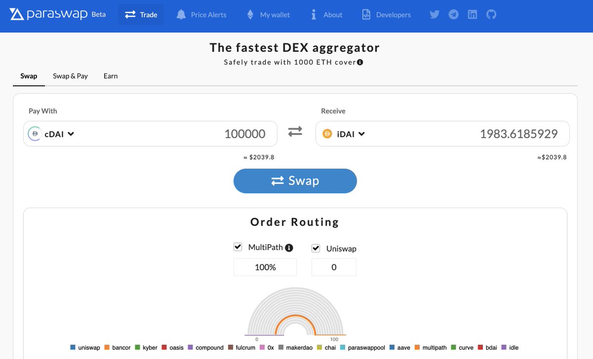 Check it out at http://paraswap.io/#/cDAI-iDAI/100000 …pic.twitter.com/0tEILOmFAL