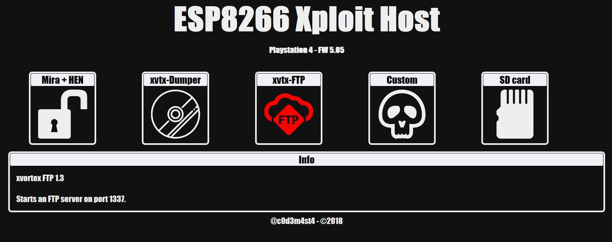 This is for those who don't like reading manuals, or simply can't read. IP: 13.37.13.37 AP: ESP8266XploitHost AP Password: ps4xploit (you can change it from the tools menu) FTP user: ps4xploit FTP password: ps4xploit (if you change the AP pass, this one will change too,) Port: 21