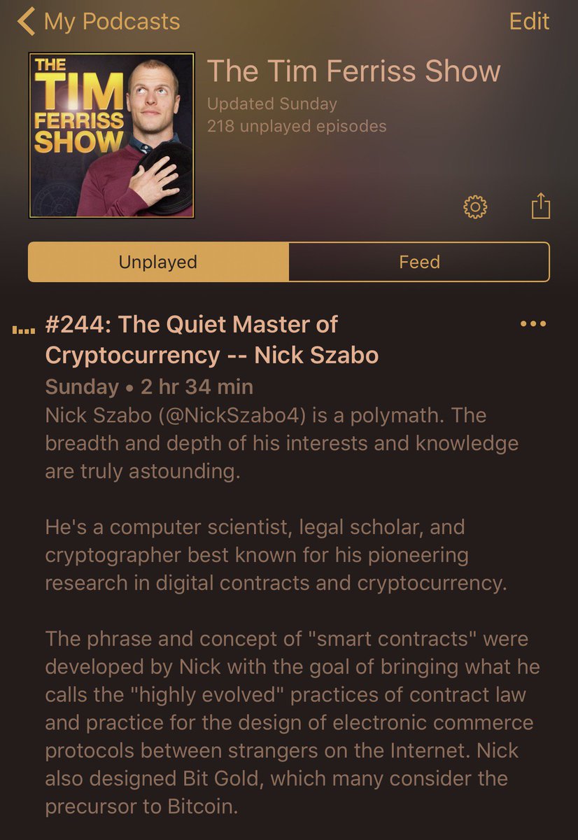 now listening to @NickSzabo4 on @tferriss podcast. #bitcoin #blockchain