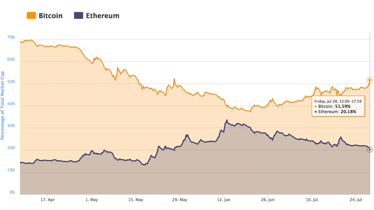 Bitcoin dominance index back above 50% for the first time since May. Crypto ecosystem $89bn, Bitcoin $46bn, Ethereum $18bn.pic.twitter.com/6VYR1gPfDd