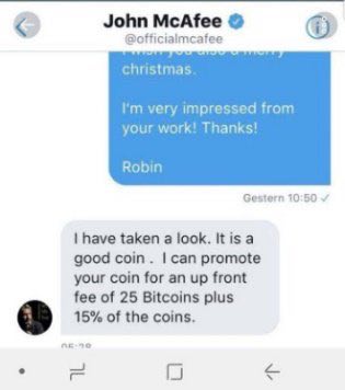 looks like @ToneVays got faked by fake @officialmcafee account. ah well, the shilling is real but the DMs is most probably fake news. it would be too naive of McAfee to conduct his shilling biz on Twitter. keep on pumping!
