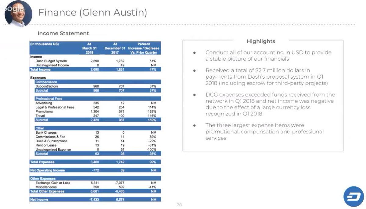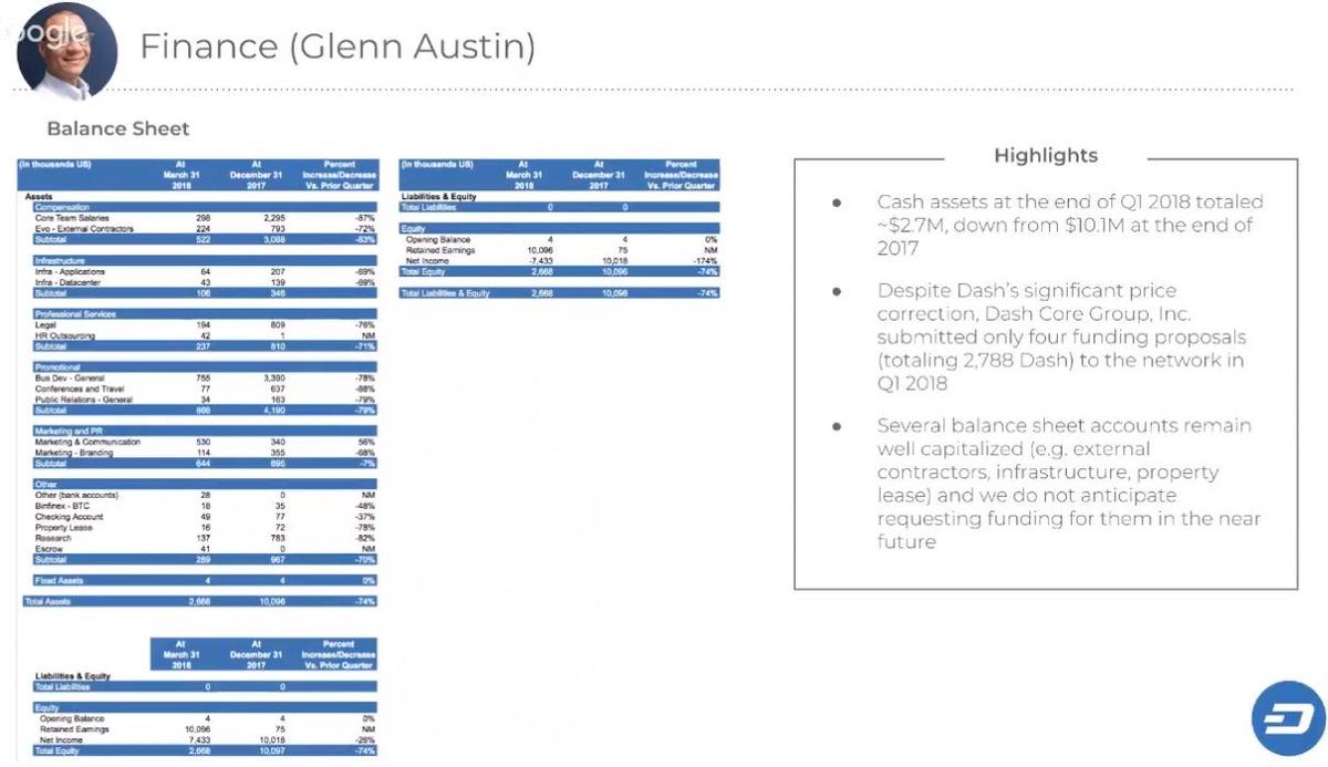 #Dash Core Group Q1 2018 Summary Call - Screenshot 📸 Glenn Austin CFO - @Dashpay Core team. Income Statement & Balance Sheet. Watch in full here: https://youtu.be/5IYyXnk4hZQ  pic.twitter.com/kIBpmWjegL