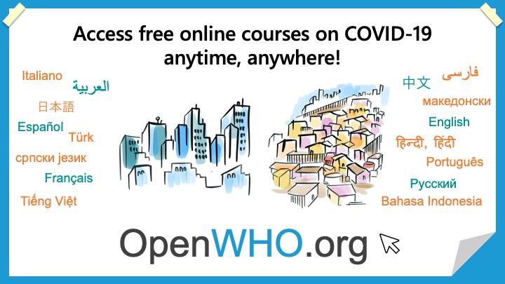 Join OpenWHO: the free, multilingual, open-access learning platform for health emergencies. Learn from public health experts about topics including COVID-19, risk communication, Ebola, infection prevention & much more. #make2020count 👉 https://bit.ly/3bvlPAO pic.twitter.com/dDVh0r7GbC