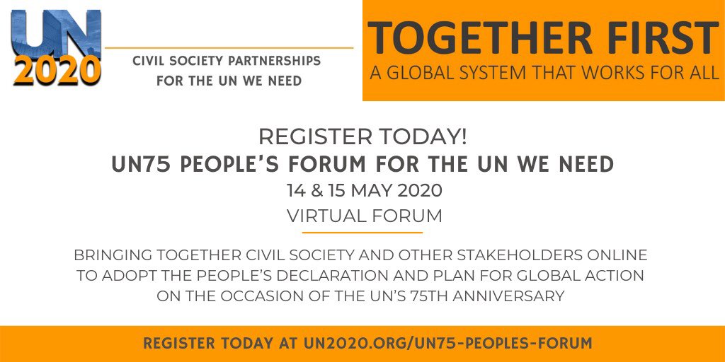@_UN2020_ has undertaken a global dialogue to develop a civil society vision for a strengthened UN, that will be reflected in a UN75 People’s Declaration & Plan of Action released at the UN75 People’s Forum, May 14 & 15. Register at http://ow.ly/5gp750zn39m #MultilateralismMatterspic.twitter.com/tZximu8dcO