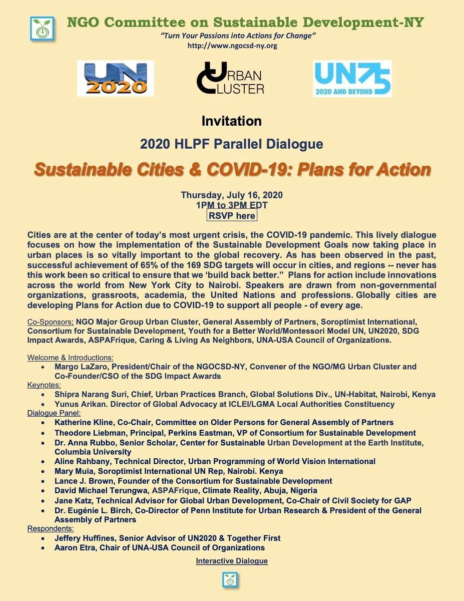 Proud to announce our 2020 HLPF Parallel Dialogue “Sustainable Cities & COVID-19: Plans for Action” TODAY (July 16th) from 1PM-3PM RSVP: Register in advance for this webinar: https://us02web.zoom.us/webinar/register/WN_VKbZQnnrQGu88lJpJudc0w …pic.twitter.com/oDNxYCl8W3