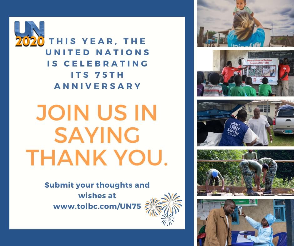 As we commemorate this UN 75th anniversary, we invite you to contribute your stories, messages, and good wishes for the future success of the UN. Go to http://www.tolbc.com/UN75 and say #ThankYouUN #MultilateralismMatterspic.twitter.com/gXPCfM4ktl