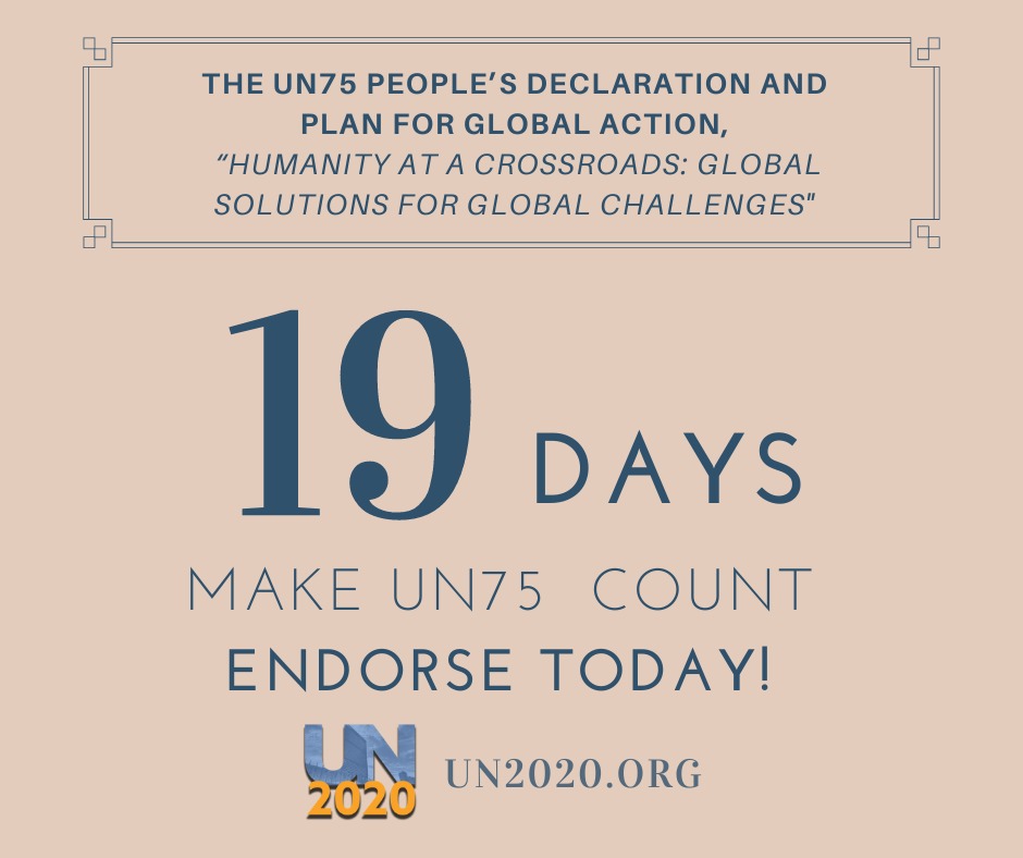 19 days to #MakeUN75Count by endorsing the #UN75 People’s Declaration. We are calling for: * increased civil society representation * UN funding * increased #globalgovernance Read the full declaration: http://un2020.org/forum-declaration/ …pic.twitter.com/SYea8dsTXc