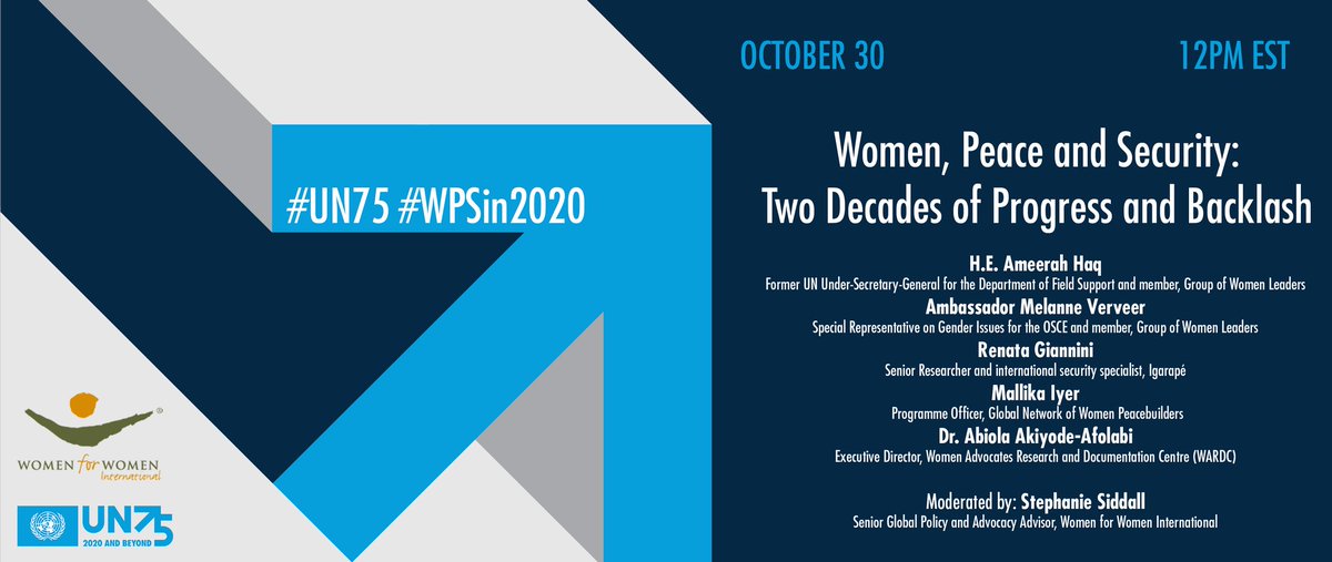 #MakeUN75Count & Join #UN75 & @WomenforWomen for ‘#Women, Peace & Security: Two Decades of Progress & Backlash’ for an all-female panel on challenges for #womensrights & building towards a more #inclusive future. #WPSin2020 📅Oct 30 ⏰12PM ET 🔗http://bit.ly/UN75WPS pic.twitter.com/gWTScJpAwE