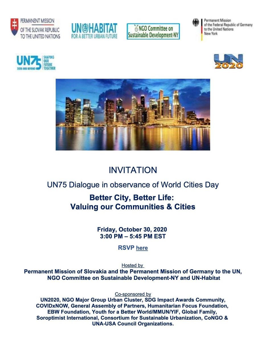 Happening Now: the NGO Committee on Sustainable Development - NY invites you to join their #UN75 Dialogue in observance of #WorldCitiesDay on Friday, Oct. 30th from 3PM to 5:45PM. #MakeUN75Count and join: http://zoom.us/webinar/register/WN_lDz6oNdoQ82hUaJktGVpuw …pic.twitter.com/mn8IFvwSyo