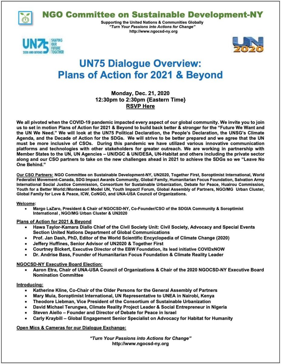#MakeUN75Count and join @NGOCSDNY on Monday, Dec. 21, 2020 from 12:30PM to 2:30PM (EST) for a “UN75 Dialogue Overview: Plans of Action for 2021 & Beyond”. RSVP Here: