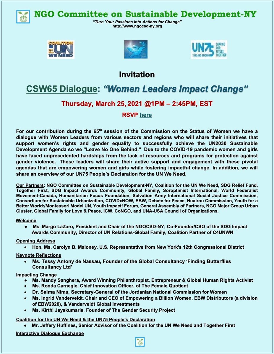 #MakeUN75Count and join the NGOCSD-NY and the Coalition for the UN We Need on Thursday, March 25th from 1-2:45pm for our interactive #CSW65 side event--"Women Leaders Impact Change"