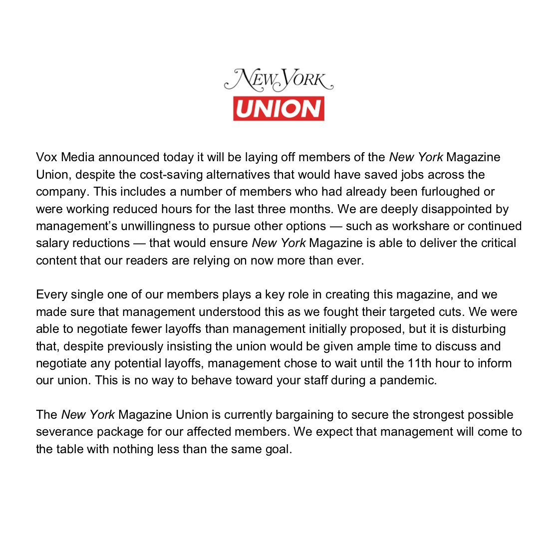Thanks to everybody who’s reached out, I really appreciate it. Unionize your workplace! It’s a tremendous relief to know that my union is fighting for me and everybody that NY mag laid off. We’d be in a much, much worse spot without