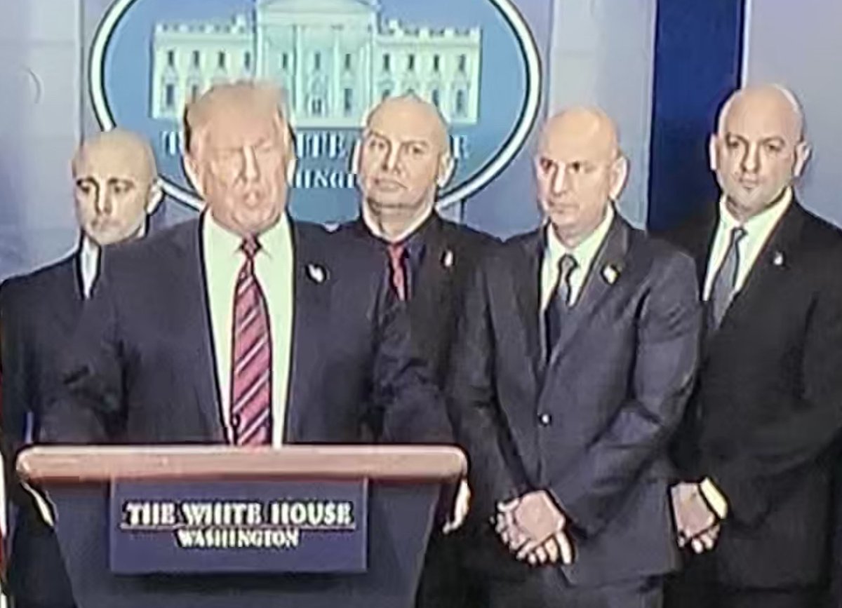 Donald Trump held a press conference with these guys behind him. Not sure if they’re supposed to be his Russian mafia handlers, or a bad ripoff of the Robert Palmer girls.pic.twitter.com/IUv8Qb7EmE