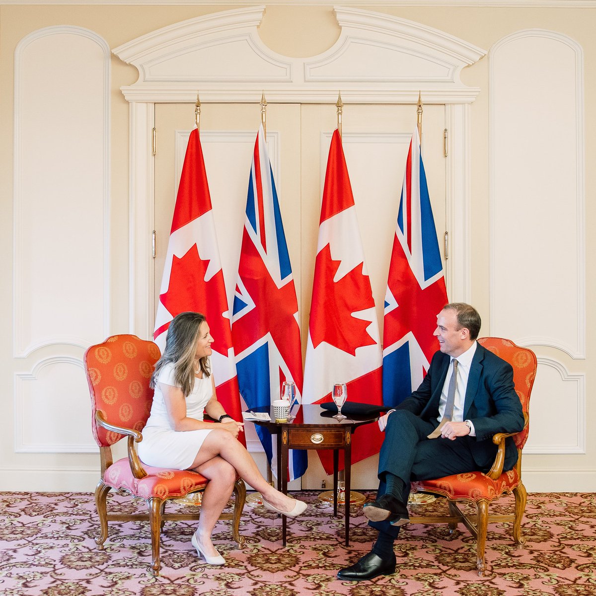 Ravie d'accueillir mon nouvel homologue britannique, @DominicRaab, à Toronto pour sa première visite bilatérale depuis sa nomination! Nous avons discuté de notre engagement commun envers un ordre international fondé sur des règles, la démocratie et les droits de la personne.pic.twitter.com/yaQCx4OQuj