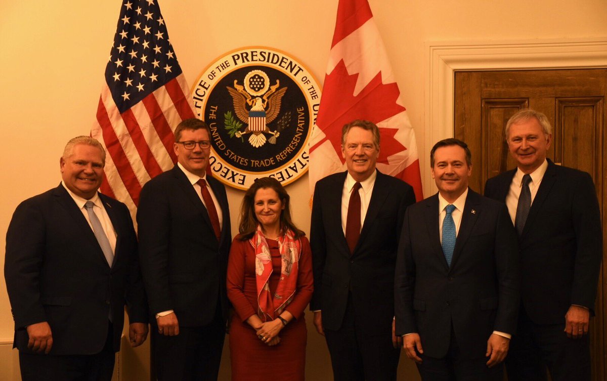 Le commerce entre le Canada et les États-Unis est au cœur de notre prospérité. Lors de notre réunion avec @USTradeRep à Washington auj, @jkenney, @PremierScottMoe, @fordnation, & @BlaineHiggs se sont mis d’accord que nous devons ratifier le nouvel #ALÉNA rapidement. #ÉquipeCanadapic.twitter.com/uMk828jLVc
