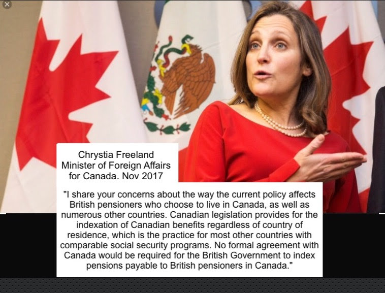 Therefore Ms. Freeland , I implore you and the G7 to press the UK to fix this grotesque injustice. It is not only impoverishing seniors in frozen countries like Canada , it is a burden on taxpayers having to subsidize them to make ends meet. "Global Britain" needs to prove it !!!